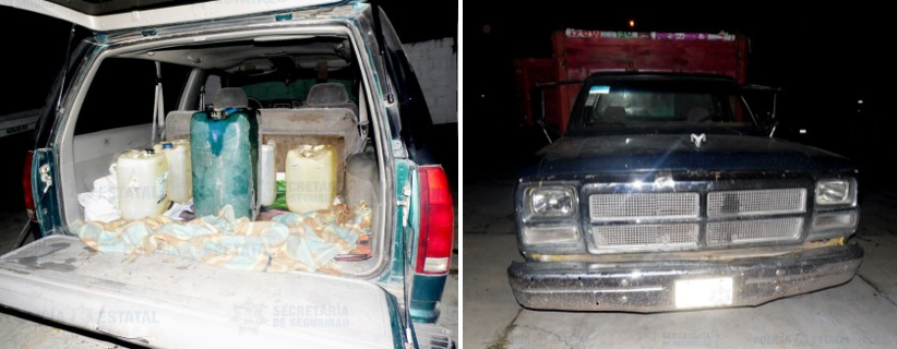 Elementos de la Secretaria de Seguridad (SS) resguardaron dos camionetas que transportaban aproximadamente 3 mil 150 litros de hidrocarburo de dudosa procedencia, además de que detuvieron a dos probables responsables.