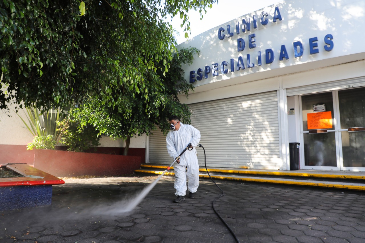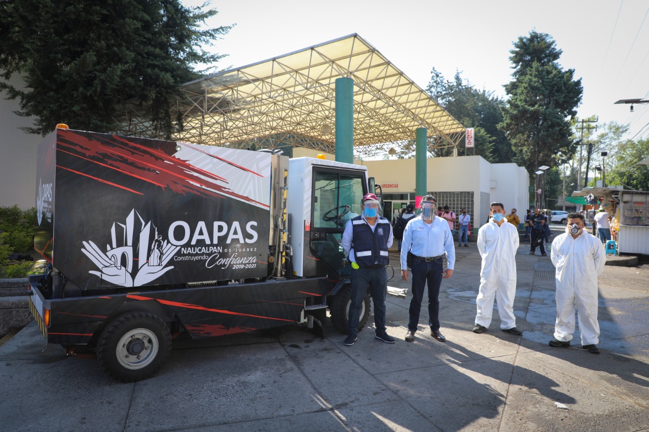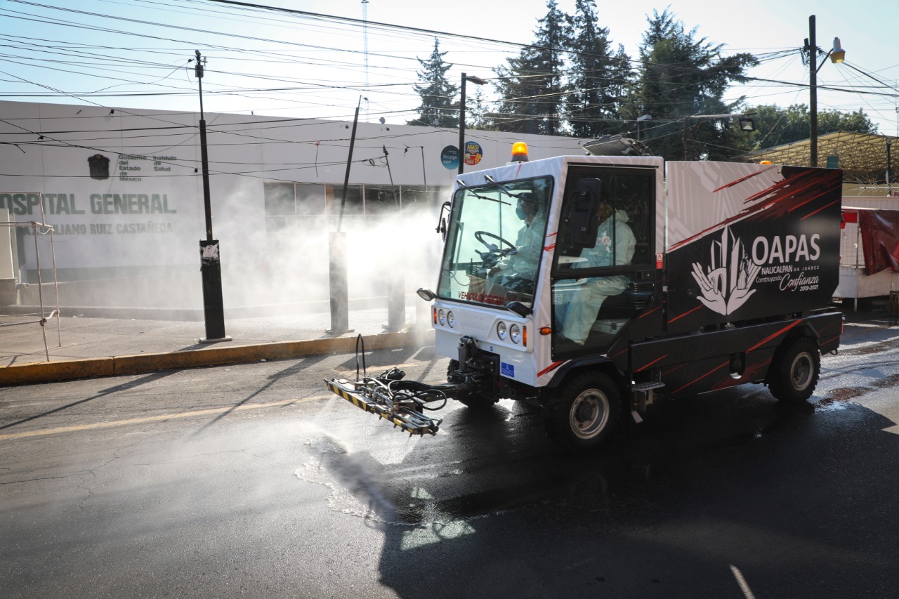 Como parte de esta labor, el Organismo de Agua Potable, Alcantarillado y Saneamiento (OAPAS) realizó una jornada de sanitización en la periferia del Hospital General “Maximiliano Ruiz Castañeda”, a fin de mitigar los riesgos de contagios.