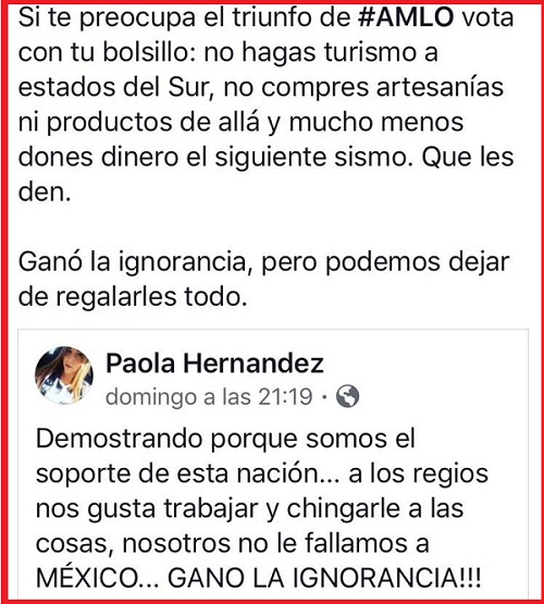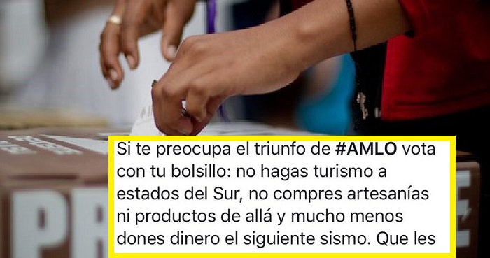 Usuarios le responden que si no están de acuerdo con el triunfo de AMLO habría que votar con “el bolsillo”, y no visitar estados del sur y dejar de comprar artesanías indígenas.