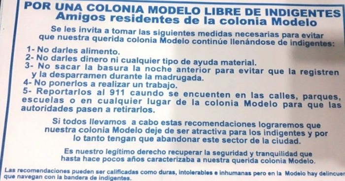 “Se les invita a tomar las siguientes medidas necesarias para evitar que nuestra querida colonia Modelo continúe llenándose de indigentes: