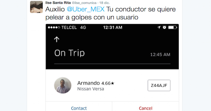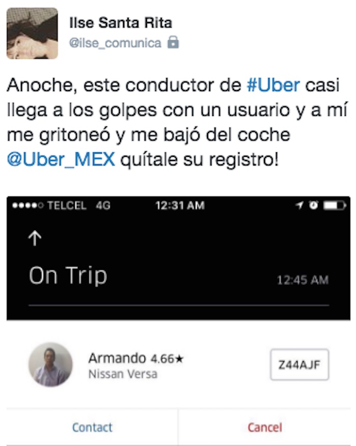 En otro tuit de Santa Rita, declaró que Armando, el conductor de Uber, estuvo a punto de llegar a los golpes contra un usuario que compartía el viaje con la reportera (en UberPool) y a ella le gritó, además la bajó del automóvil en una colonia “desconocida”; todo esto a la media noche. De igual manera pidió que al chofer le fuera retirado su registro.