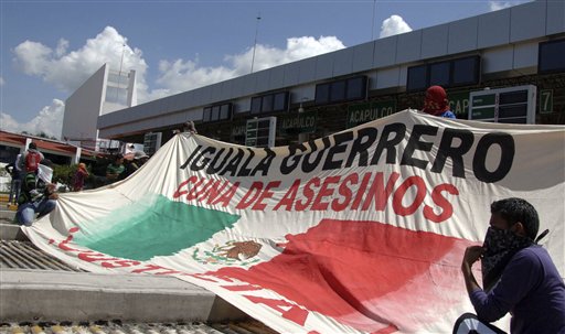 Estudiantes y familiares de los 43 alumnos desaparecidos de la escuela rural normalista Isidro Burgos despliegan una manta frente a una caseta de peaje de una importante autopista que cruza la ciudad de Chilpancingo, México, el martes 7 de octubre de 2014. Los alumnos desaparecieron tras una confrontación el 26 de septiembre con la policía de la cercana ciudad de Iguala, que dejó un saldo de seis alumnos y transeúntes muertos. El gobierno nacional ha enviado agentes federales al estado de Guerrero tras el descubrimiento de varias fosas clandestinas, y afirma que la policía de Iguala puede haberse confabulado con con una pandilla criminal para matar y desaparecer a los estudiantes. (Foto AP/Alejandrino González)