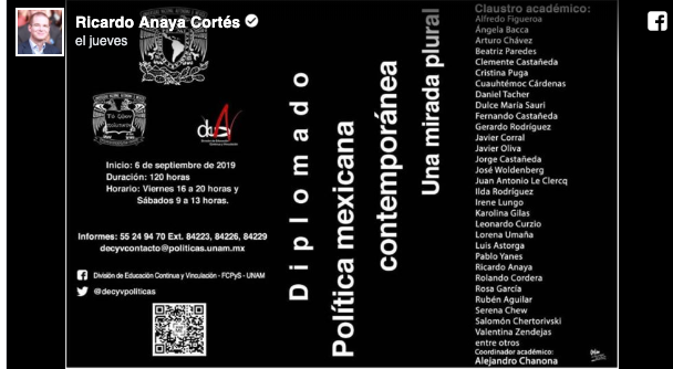 Ricardo Anaya Cortés, ex candidato a la Presidencia por el Partido Acción Nacional (PAN), impartirá un diplomado sobre política mexicana contemporánea en la Universidad Nacional Autónoma de México (UNAM).