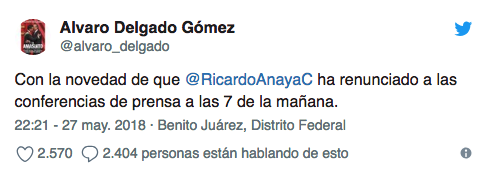Incluso, Álvaro Delgado, periodista e investigador del semanario Proceso, adelantó a través de su cuenta de Twitter que el candidato de la coalición ‘Por México al Frente’ decidió suspender de manera definitiva sus conferencias de las siete de la mañana, una de las –muchas- propuestas que parecen copiadas de su rival Andrés Manuel López Obrador, quien se mantiene arriba en las encuestas.