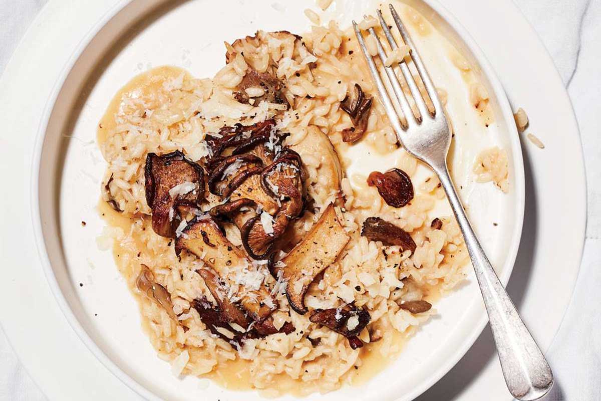 Las setas asadas concentran su sabor mientras que el vermut seco le da un impulso aromático a este risotto por demás clásico.
