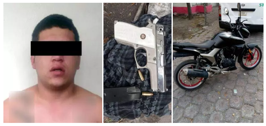 Agregó que como resultado de la respuesta policiaca se detuvo a Guillermo “N”, de 20 años de edad, al que le fue asegurada un arma de fuego calibre 9 milímetros, un cargador con dos cartuchos útiles del mismo calibre y una motocicleta, que mantenía estacionada para escapar al momento de descender de la unidad.