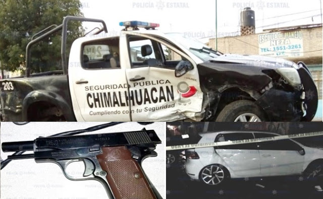 Elementos de seguridad realizaron la detención de dos jóvenes implicados en el robo de un vehículo, al intentar huir se impactaron contra una patrulla en el municipio de Chimalhuacán.