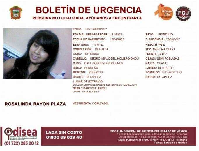 Autoridades del Estado de México emitieron un boletín de urgencia para localizar a Rosalinda Rayon Plaza de 15 años de edad, quien fue vista por última vez hoy 25 de Septiembre en la colonia Lomas de Cadete, Naucalpan de Juárez.