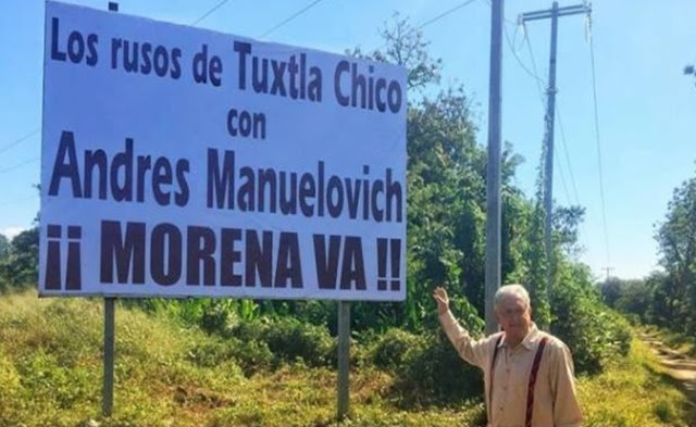 “Los rusos de Tuxtla Chico con Andres Manuelovich ¡¡Morena va!! (sic)”, dice el cartel en donde posó el dos veces candidato a la Presidencia de la República.