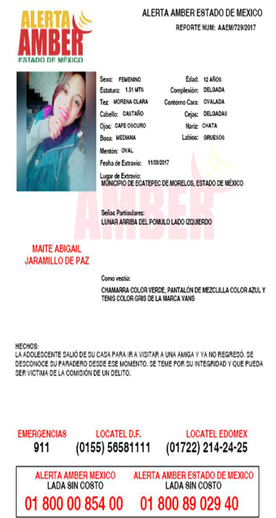 Si conoces algún dato que pueda servir para su localización, comunícate al número de Alerta Amber México, el 01 800 00 854 00.
