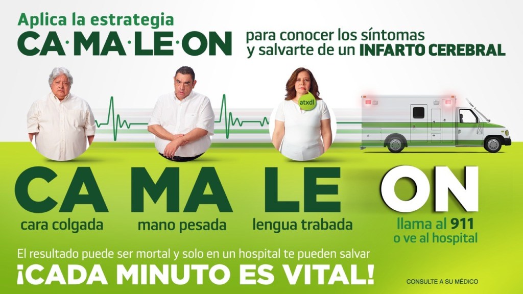 Con el propósito de evitar el sufrimiento humano por esta condición neurológica, el día de hoy la Sociedad Mexicana de Medicina de Emergencias (SMME), la Asociación Mexicana de Enfermedad Vascular Cerebral (AMEVASC) y el Sistema Nacional de Llamadas de Emergencia 911, presentaron una campaña de responsabilidad social que, a través de la nemotecnia CAMALEÓN, permitirá a los mexicanos reconocer oportunamente los signos y síntomas del infarto cerebral: