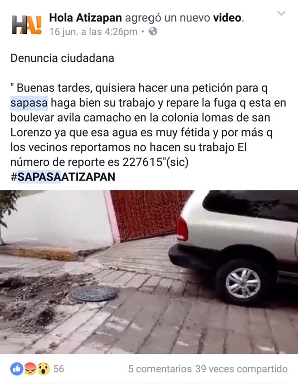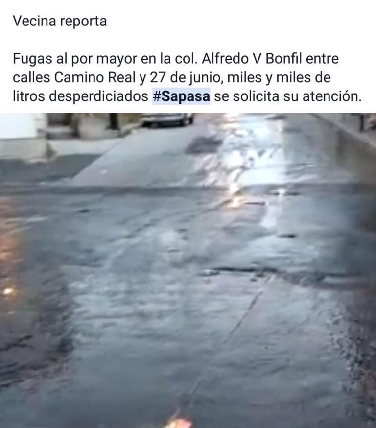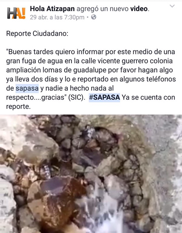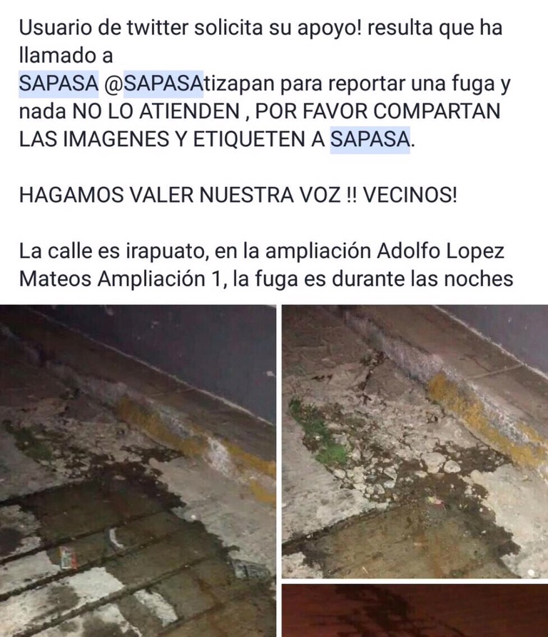 Algunos de estos reportes refieren que en efecto habian llamado a numero de S.A.P.A.S.A. para levantar un reporte donde se les entrega un numero con el cual queremos entender se le dara seguimiento a la brevedad posible, pero vecinos, la mayoria de los casos recurren a nosotros para pedir de favor que subamos dichas denuncias esperando el organismo de agua lea y vea en nuestra Fan Page dicho reporte/denuncia para que sea atendido.
