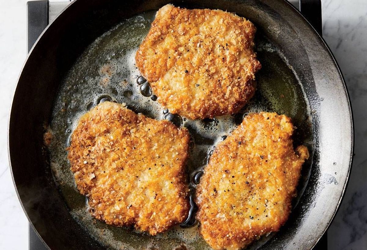 Enharina el cerdo en hojuelas secas de papa antes de freírlos en mantequilla para formar una corteza increíblemente crujiente sin gluten. Sumerge las proteínas en huevos batidos antes de recubrirlas con las hojuelas, presionando para ayudar a que se adhieran.