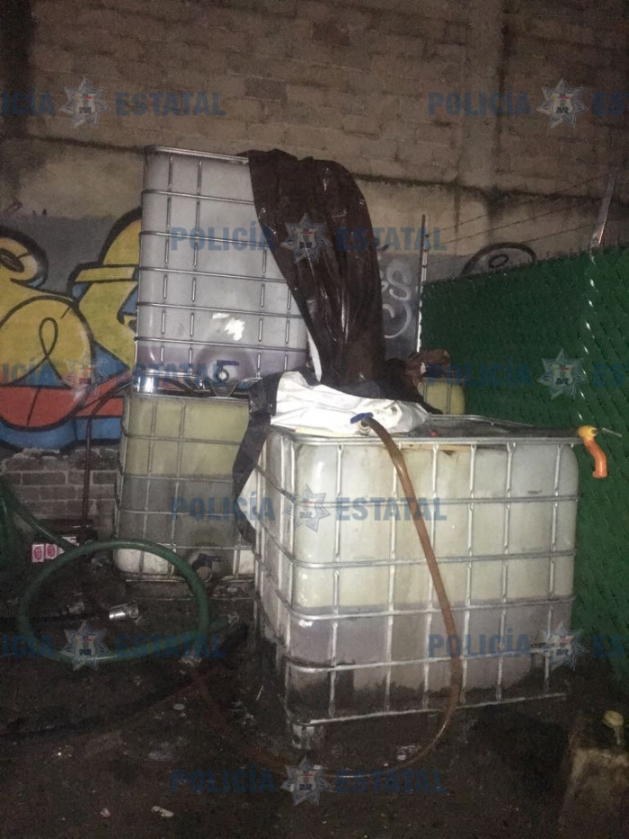 En el lugar se localizaron, entre otros recipientes, cuatro contenedores de 250 litros cada uno, al cien por ciento de su capacidad; cuatro más de mil 500 litros, uno con 750 litros en su interior, y uno más con 450 litros aproximadamente.