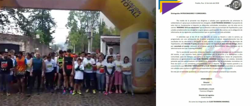 Alcalde del municipio de Tepetlaoxtoc, Rolando Trujano Sánchez, se negó a cumplir con uno de sus compromisos deportivos, en beneficio de la juventud, cuando ya no quiso apoyar a los organizadores de La Carrera del club Trainning Makinaz.