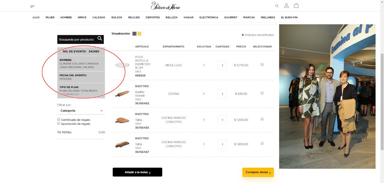 En el informe de El Palacio de Hierro, el conjunto de obsequios aparece indicado bajo el Plan Celebra que, según El Financiero, consiste en que en vez de que los invitados pasen horas escaneando productos para que sean enviados a los novios, compran un ‘artículo virtual’ cuyo costo se abona a la tarjeta departamental de la pareja, con la cual podrá elegir qué cosas quiere comprar o si prefiere usarlo para su luna de miel.