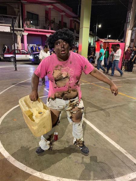 Sin embargo, tres salieron caracterizados con ropa quemada, caras desfiguradas y bidones, recordando a las víctimas de la explosión de una toma clandestina en Tlahuelilpan, HIdalgo.