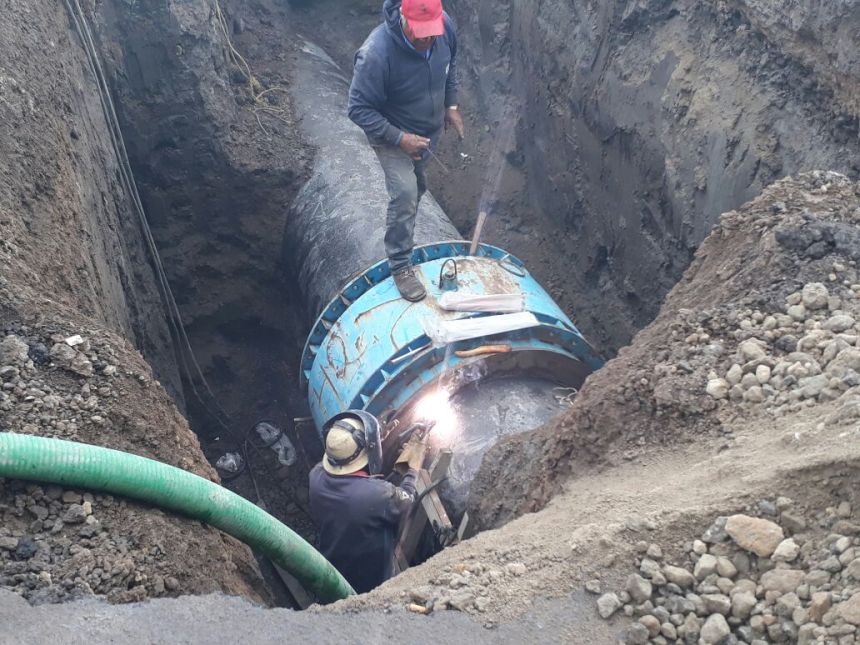 Trabajando a marchas forzadas en la reparación, se ha avanzado un 50%, teniendo que abrir el suelo con retroexcavadoras y desaguando para poder hacer las reparaciones con soldaduras por dentro de la línea de conducción.