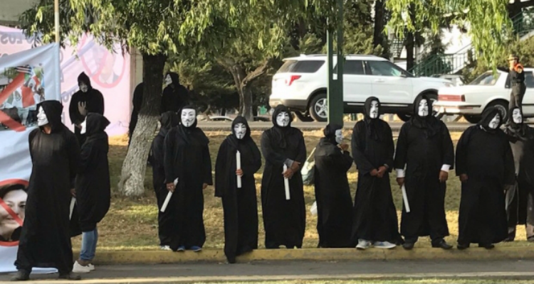 Los inconformes vestidos con túnicas de color negro y máscaras de “Anonymous”, mostraron lonas en las que destacaban los casos controvertibles alrededor de Delfina Gómez Álvarez, Josefina Vázquez Mota y Alfredo Del Mazo.