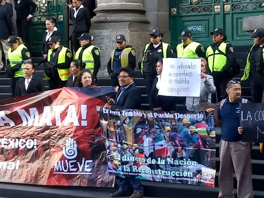 En el exterior de la ALDF sobre las escalinatas se encuentran 20 integrantes del Movimiento de Unidad y Encuentro Vecinal y de la Coordinación de Damnificados y Vecinos de Benito Juárez, que se manifiestan en contra de la aprobación de la Ley de Reconstrucción y Recuperación de la Ciudad de México que será votada el día de hoy, y que envío el Jefe de Gobierno, Miguel Ángel Mancera.