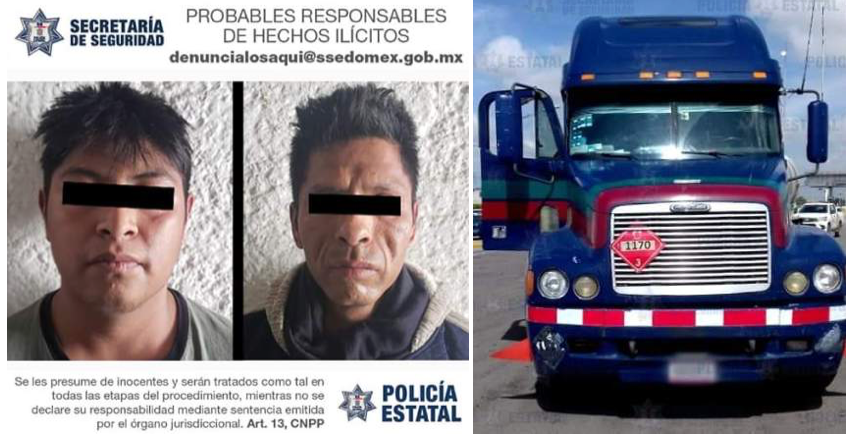 Los elementos de seguridad vieron a los sospechosos que viajaban en el tracto camión robado y capturaron a Héctor Miguel “N”, y Eusebio “N”, de 34 y 21 años de edad, respectivamente.