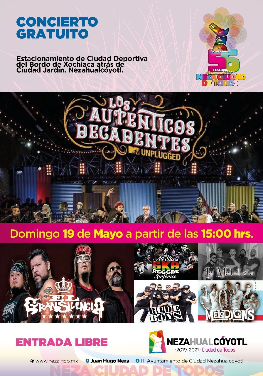 Con el objetivo brindar a los jóvenes un momento de sano esparcimiento con motivo del 56 aniversario de Nezahualcóyotl, el presidente municipal Juan Hugo de la Rosa García anunció que este domingo 19 de mayo se sumarán al magno concierto a realizarse en el estacionamiento de la deportiva municipal Bordo de Xochiaca el talento de El Gran Silencio, La Matatena y Melodycans además de Los Auténticos Decadentes, los Rude Boys y el colectivo Alls Star Reggae Ska.