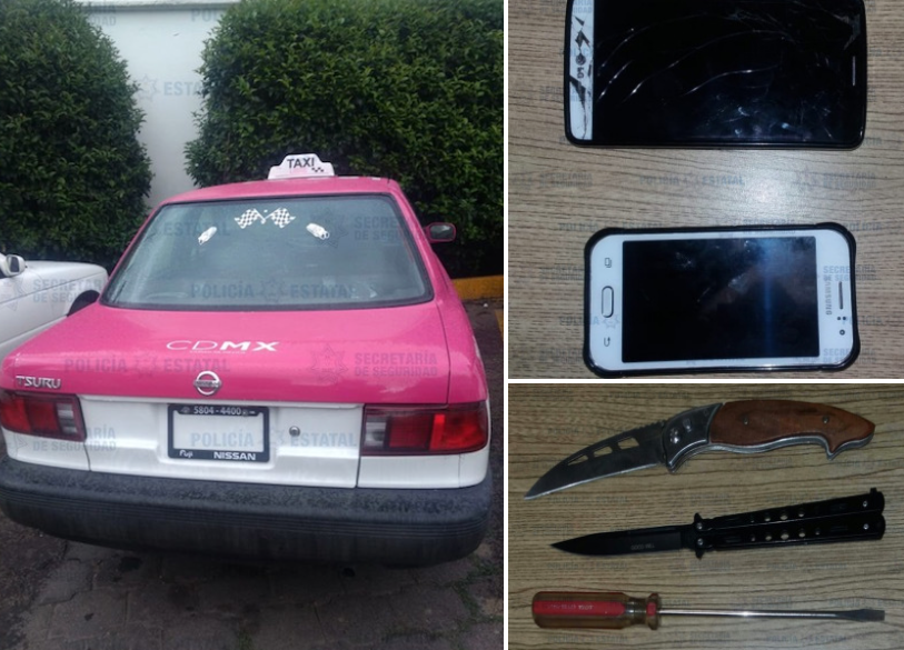 Los Policías Estatales fueron alertados por una persona que presenció cuando el conductor de un vehículo Nissan, tipo Tsuru, con cromática de taxi de la Ciudad de México, fue amagado con armas punzocortantes por los presuntos responsables.