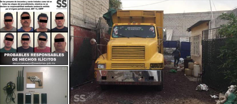 Efectivos de la Secretaría de Seguridad (SS) en colaboración con la Fiscalía General de Justicia del Estado de México (FGJEM), capturan a 8 sujetos que llevaban un vehículo robado, cargado de mercancía valuada en más de un millón de pesos.