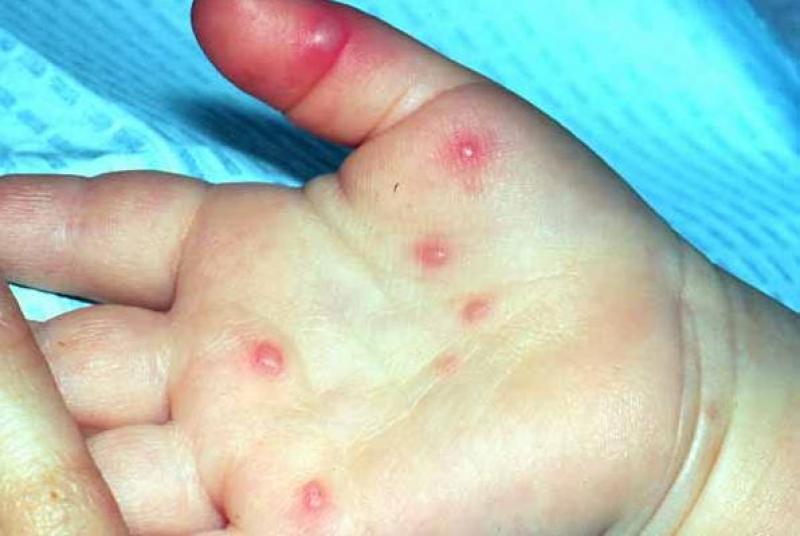 Entre los síntomas aparecen están pequeñas ampollas en la palma de las manos o pies, llagas pequeñas en la boca similares a las de varicela, además de fiebre durante tres días, dolor de cabeza, garganta y malestar abdominal.
