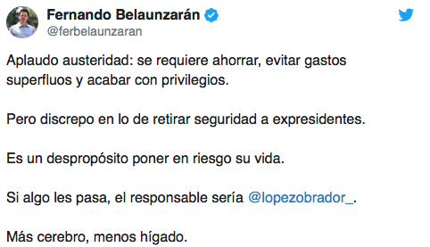 Por medio de su cuenta de Twitter, Belaunzarán dijo aplaudir que el tabasqueño proponga llevar a cabo una administración en la que evite “gastos superfluos y acabar con privilegios”.