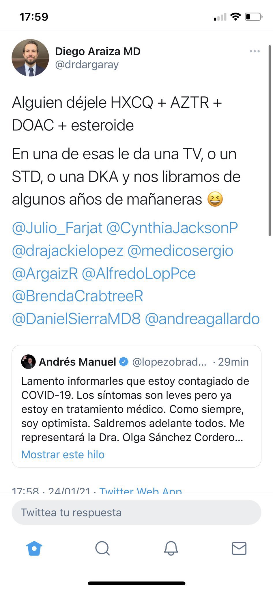 Tras las críticas que se hicieron por su falta de ética y responsabilidad médica, Araiza eliminó su cuenta de Twitter, horas más tarde, la reactivó para tuitear una “disculpa pública” y luego nuevamente eliminó su cuenta.
