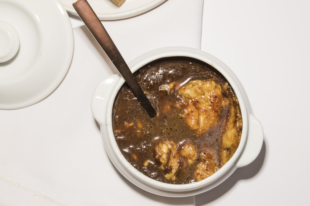 “La típica sopa de cebolla francesa tiene todos los elementos umami, sobre todo en el fondo, la caramelización de la cebolla, el crutón tostado y la mezcla de quesos.” Esta versión del chef, lleva un caldo robusto de pollo como fondo que le da un toque untuoso y sabroso.