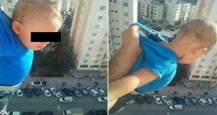 on una mano tomó de la playera al pequeño y lo llevó a la ventana del apartamento ubicado en el piso 15 de un edificio en Argelia, con la otra, tomó una foto con su celular y posteó en Facebook: “1,000 me gusta o lo dejaré caer”.