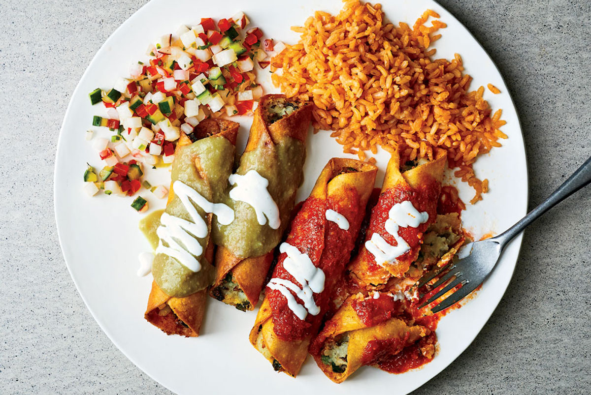 6 Toma las tortillas y el aceite; sigue las instrucciones de ensamblaje y freído de la izquierda. Sirve los taquitos calientes con la salsa de tu elección y el arroz rojo.