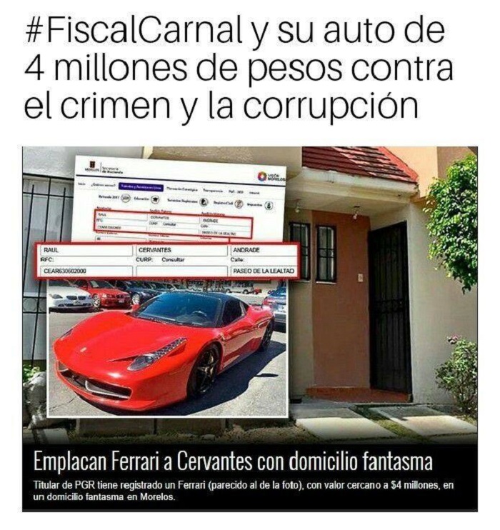 Una investigación realizada por la organización Mexicanos Contra la Corrupción y la Impunidad da cuenta de que el actual Procurador General de la República, Raúl Cervantes Andrade, emplacó un auto Ferrari 458 Coupé en un domicilio que corresponde a una vivienda de interés social, que se encuentra deshabitada y se ubica en Xochitepec, Morelos.