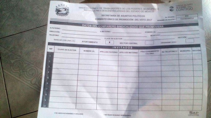 En el caso de Ecatepunk, empleados del Ayuntamiento denunciaron que a nombre del secretario Ramiro Ibarra, se les han entregado un formato de papel a nombre del Sindicato Único de Trabajadores de los Poderes Municipales e Instituciones Descentralizadas del Estado de México. Allí deben poner sus datos y de las personas comprometidas a votar por Alfredo del Mazo.
