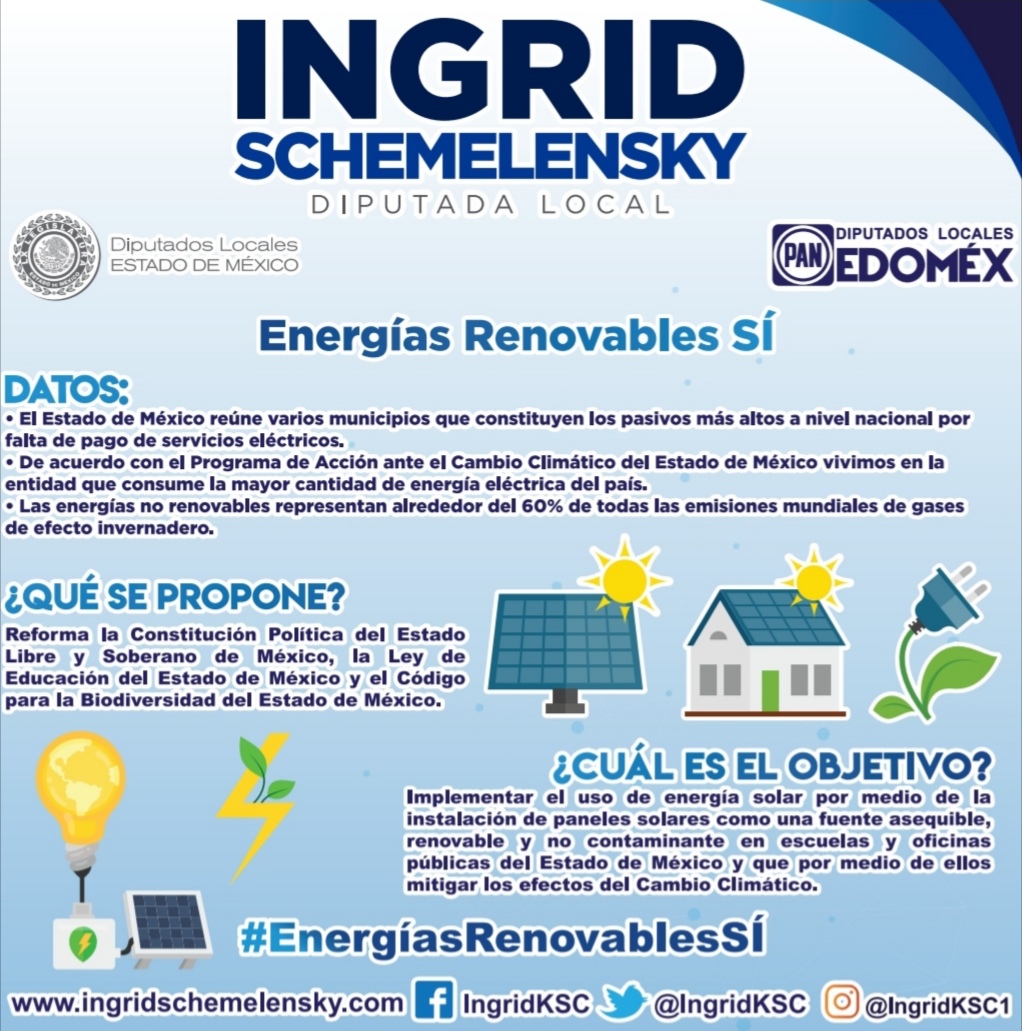 Mediante esta propuesta la legisladora panista planteó el beneficio, pertinencia y oportunidad de que en el Estado de México, se instalen paneles solares en las Escuelas de Educación Básica, Media y Superior; así como en oficinas públicas del Gobierno de la misma Entidad, fomentando así el uso de energías renovables para mitigar los efectos del Cambio Climático.