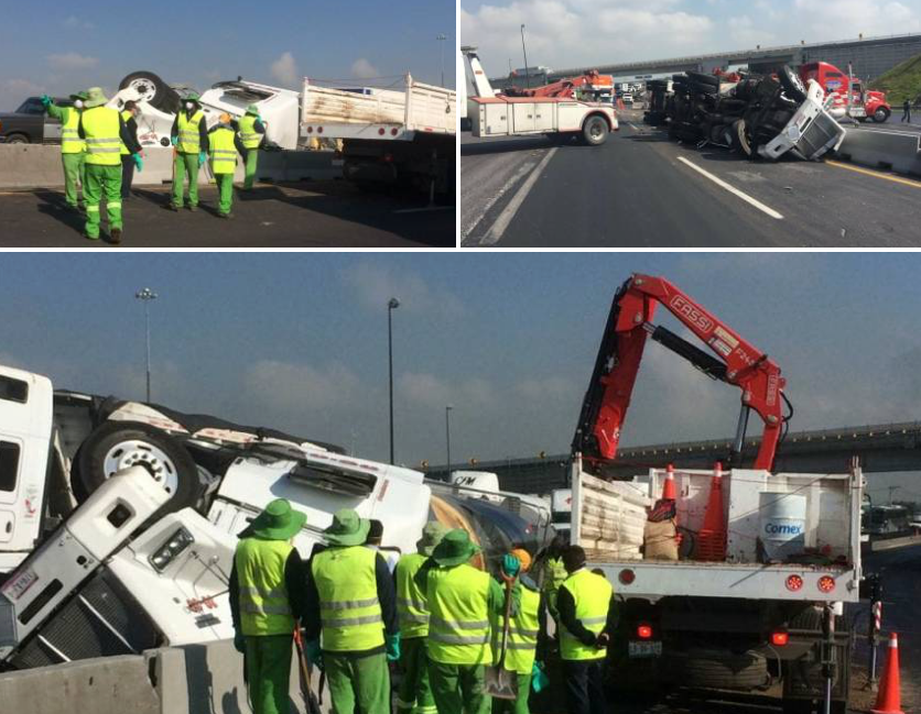 Un camión cargado con 30 mil litros de resinas tóxicas, se volteó en el kilómetro 23+300 del Circuito Exterior Méxiquense, con dirección a Ecatepec.