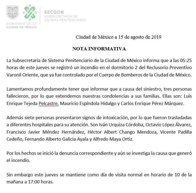 La subsecretaría del Sistema Penitenciario informó que los fallecidos son Luis Enrique Tejeda Pelcastre, Mauricio Espíndola Hidalgo y Carlos Enrique Pérez Márquez.