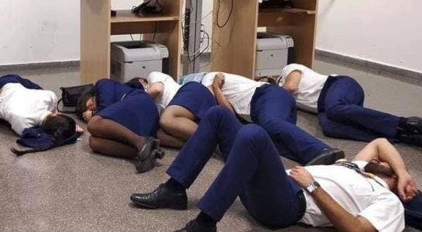 Una imagen que se ha viralizado en redes muestra a la tripulación de un avión de Ryanair durmiendo en un aeropuerto tras quedar varados en tierra por causa de una tormenta.