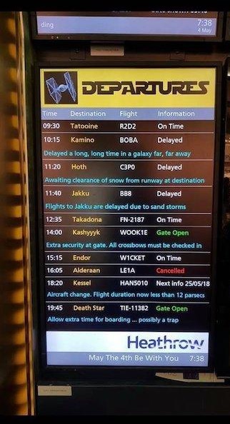 Los usuarios del aeropuerto de Heathrow, en Londres, se llevaron una sorpresa cuando vieron en las pantallas vuelos con destino a las distintas estaciones de Star Wars, sobre todo aquellos que no están tan familiarizados con la saga.
