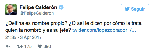 Ciudad de México.- Felipe Calderón resbaló, nuevamente, en un mensaje publicado en su cuenta de Twitter, donde se burló del nombre de la candidata de Morena al gobierno del Estado de México, Delfina Gómez.