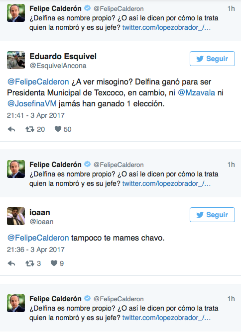 El comentario de Calderón Hinojosa no fue bien tomado por usuarios de esa plataforma de interacción social, quienes consideraron que el panista denostó a Gómez Álvarez por ser mujer y evidenció su misoginia. De acuerdo con la encuesta de SDPnoticias, “La Maestra” encabeza las preferencias en la entidad y supera por casi 13 puntos a la abanderada blanquiazul, Josefina Vázquez Mota.