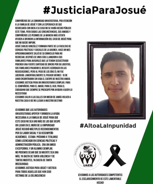 “Josué Carlos formaba parte de la facultad de Ciencias Políticas y Sociales de la UAEMex. Hace un mes aproximadamente salió de su casa para no regresar. Después de unos días llamaron a sus familiares para avisarles que lo tenían secuestrados, pidiendo una fuerte cantidad de dinero por su libertad. Sus familiares pagaron el rescate acordado en las negociaciones, pero al paso de los días él no fue liberado”.