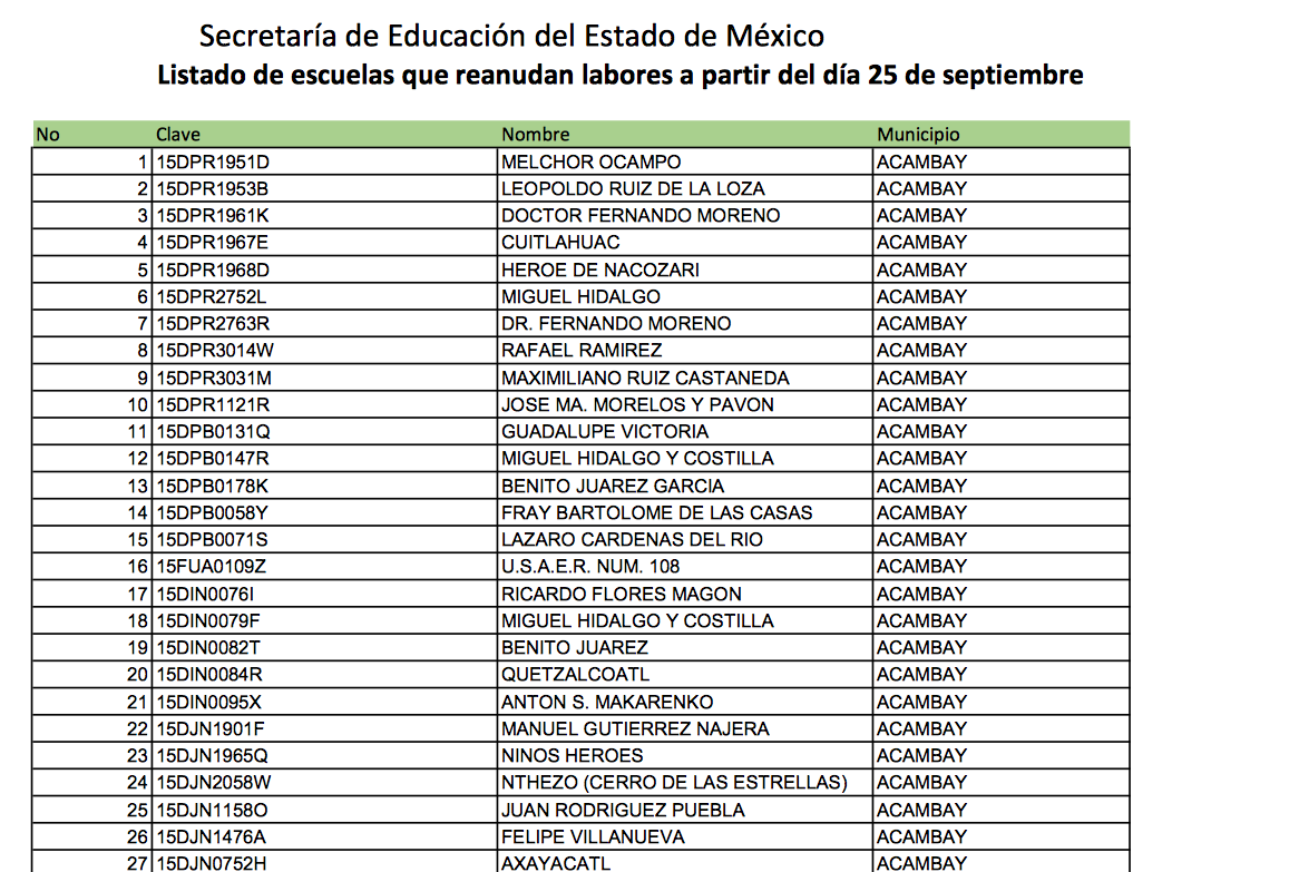 Despues de horas de incertidumbre la información oficial por parte del Estado de México de escuelas aptas para el regreso a clases mañana esta disponible ahora, ya que puede que los servidores del gobierno estatal colapsen por la consulta de ciudadanos te dejamos las dos opciones para que puedas visualizarla ahora mismo: