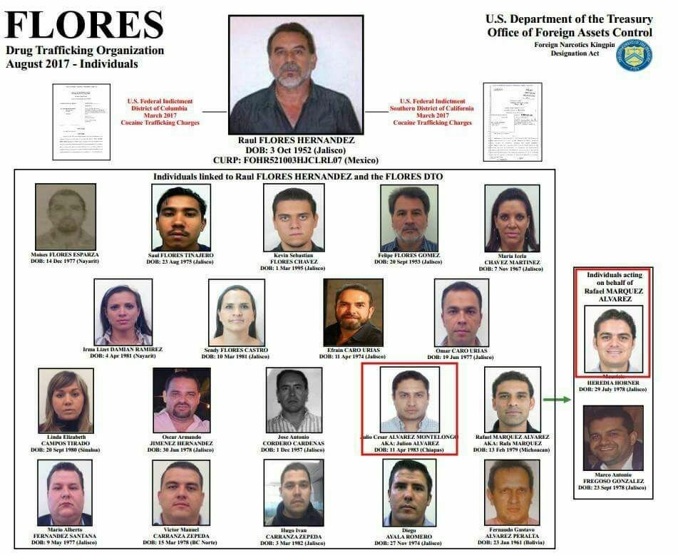 El futbolista Rafael Márquez y el cantante Julión Álvarez fueron acusados por el departamento del Tesoro de Estados Unidos por lavado de dinero y por ser prestanombres del narcotráfico. Luego de años de investigación, en conjunto con la Procuraduría General de la República (PGR) fueron revelados los lazos de dichos personajes con Raúl Flores Hernández a quien se vincula con el cartel de Sinaloa y Jalisco Nueva Generación.El futbolista es señalado por tener dos aliados para las operaciones: Mauricio Heredia y Marco Antonio Fregoso.
