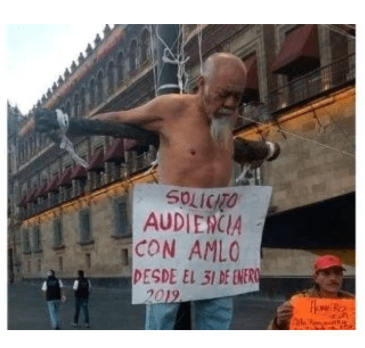 El manifestante decidió hacer una protesta auto crucificándose en una de las luminarias, con el torso desnudo, en donde se colocó una pancarta en el pecho que decía “Solicito audiencia con AMLO desde el 31 de enero 2019”.