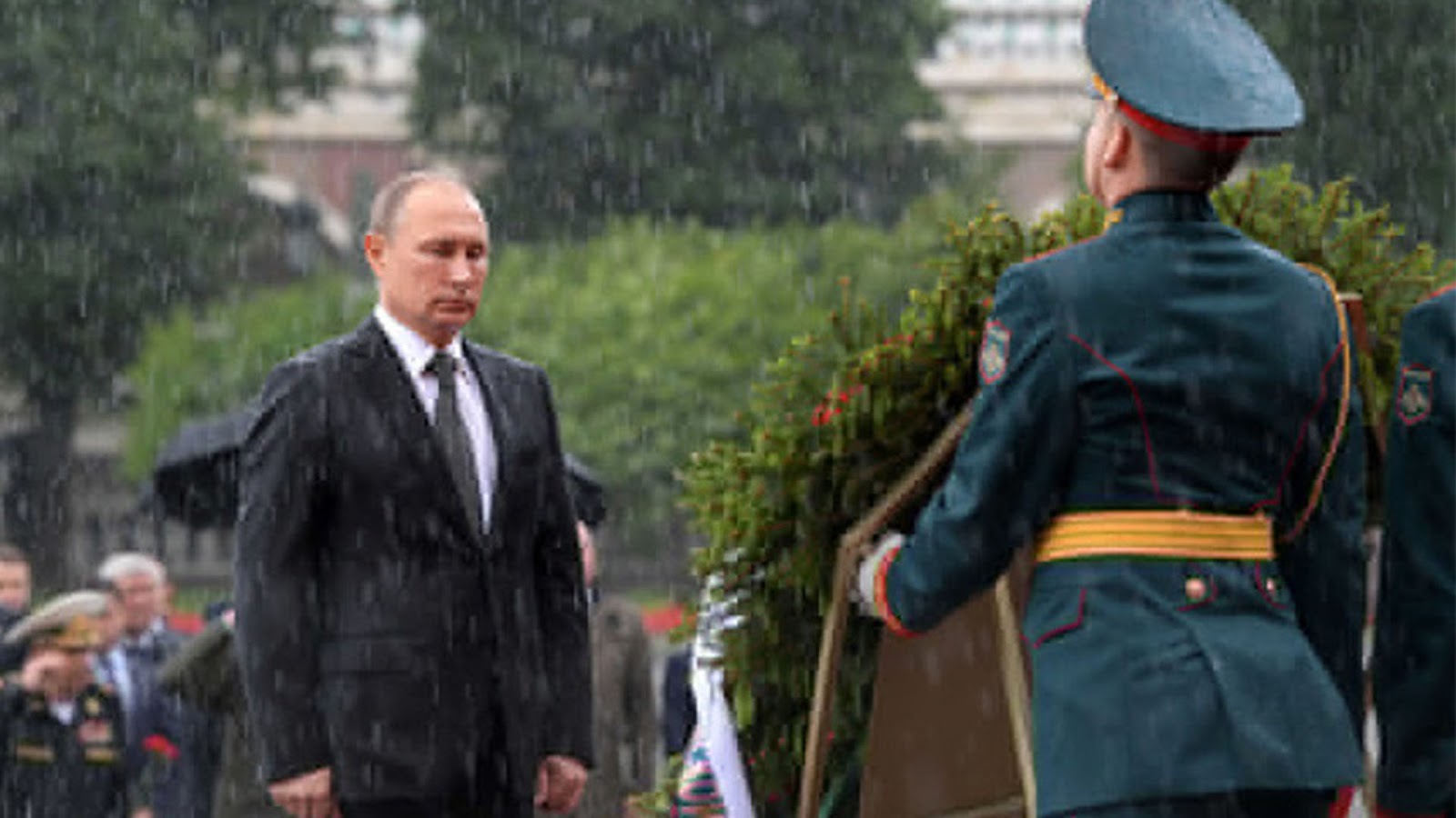 La lluvia torrencial que cayó este jueves sobre la capital de Rusia no impidió que su presidente, Vladímir Putin, participara en una ceremonia de homenaje con ofrenda floral en la Tumba del Soldado Desconocido del jardín de Alejandro, situado en uno de los laterales del Kremlin.