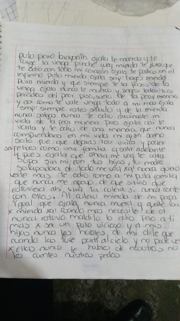 En el lugar se encuentra una carta póstuma, donde la hoy occisa insulta a su esposo, asegurando que el le arruinó la vida, por culpa de sus vicios, además de que mencionó estar molestabdon su padre, quien unca la apoyó y le pidió al marido que no le dijera a sus hijas el motivo por el que se quitaba la vida.