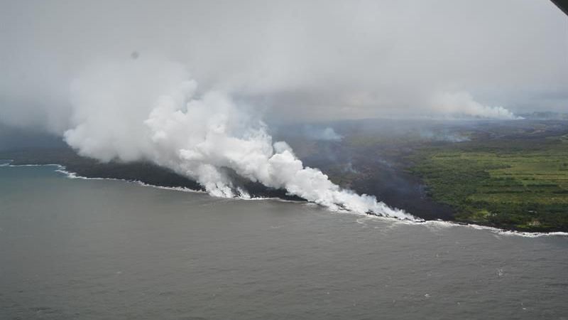 Una nueve blanca de vapor tóxico siguió hoy elevándose sobre el cielo de Hawái mientras que los ríos de lava del volcán Kilauea llegaban al océano Pacífico, en lo que supone un nuevo peligro para la población tras la erupción de hace dos semanas.